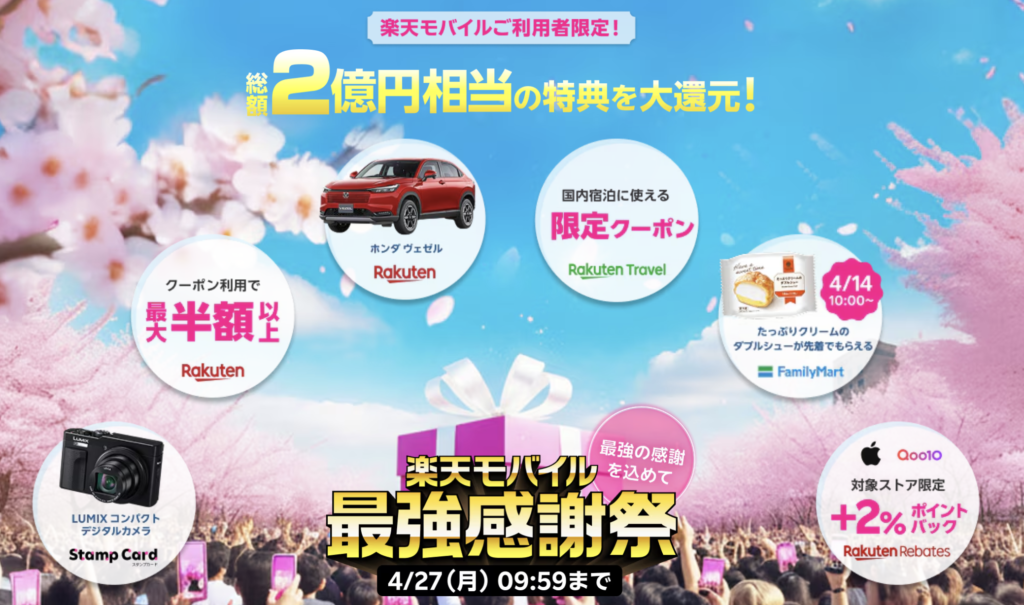 結論から申し上げます。今回の最強感謝祭は、楽天モバイルの既存・新規契約者を対象に、グループの20以上のサービスから総額2億円相当の特典を分配する施策です。