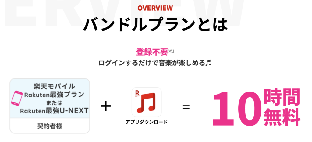 • 内容: 「バンドルプラン(楽天モバイル契約者対象)」により、30日ごとに合計10時間まで全楽曲が再生可能。