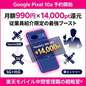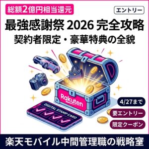 なお、これから楽天モバイルを導入される方は、申し込み前の「従業員紹介キャンペーンエントリー」を絶対にお忘れなく。1万ポイント以上の還元(MNPなら14,000pt)を逃すのは、家計のPL(損益計算書)における最大の損失です。