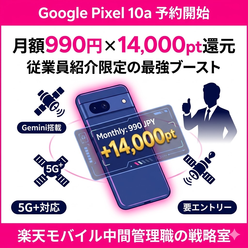 こんにちは、楽天モバイルの中間管理職です。 2026年4月7日、Googleの最新AIスマホ「Google Pixel 10a」の予約が開始されました。 現場のマネージャー視点で見ても、今回のPixel 10aは独自AI「Gemini」のポテンシャルを最大限に引き出す「Google Tensor G4... -